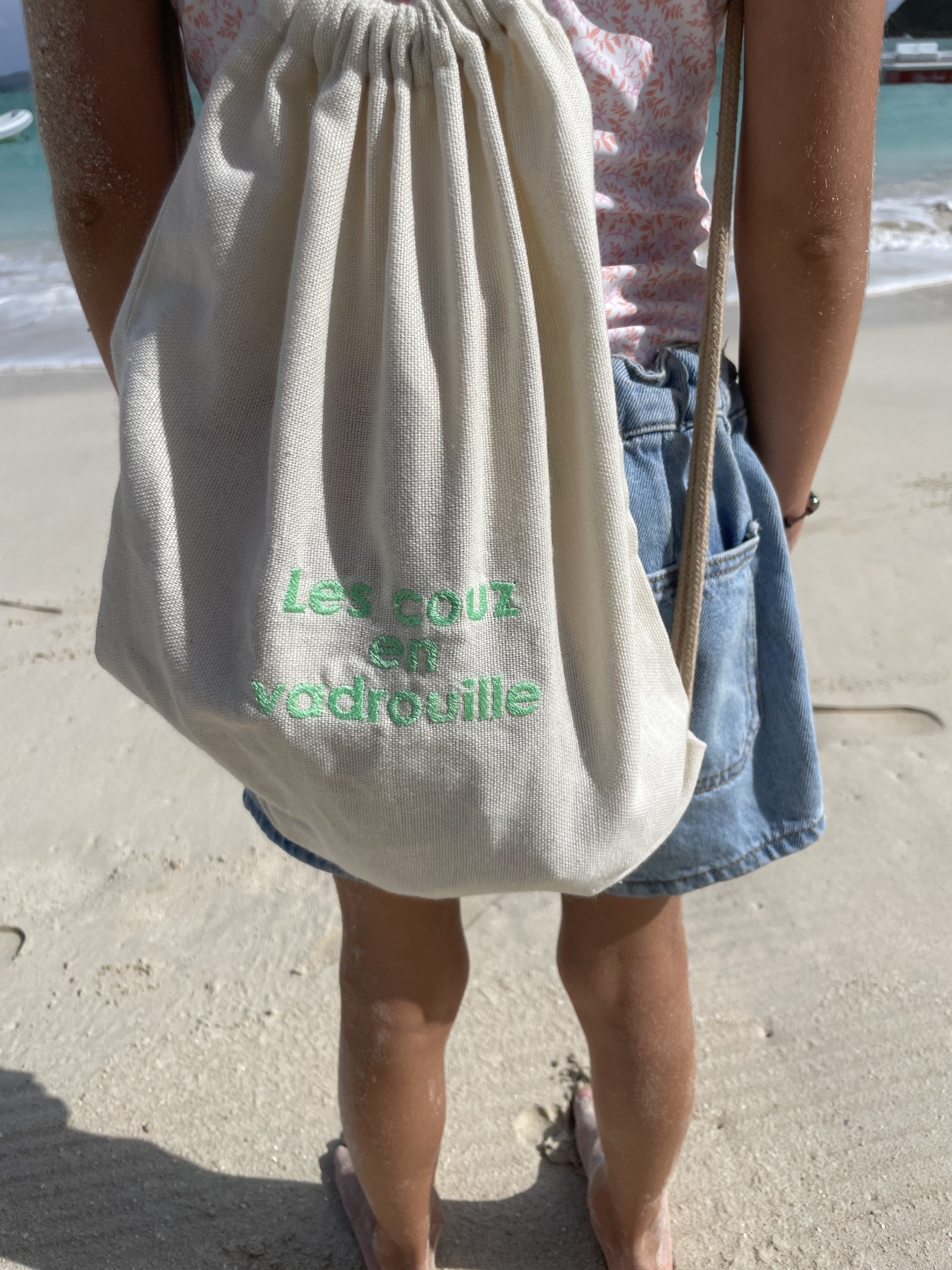 Petit sac au dos (200g/m2) de 20*30cm brodé « les couz en vadrouille ».